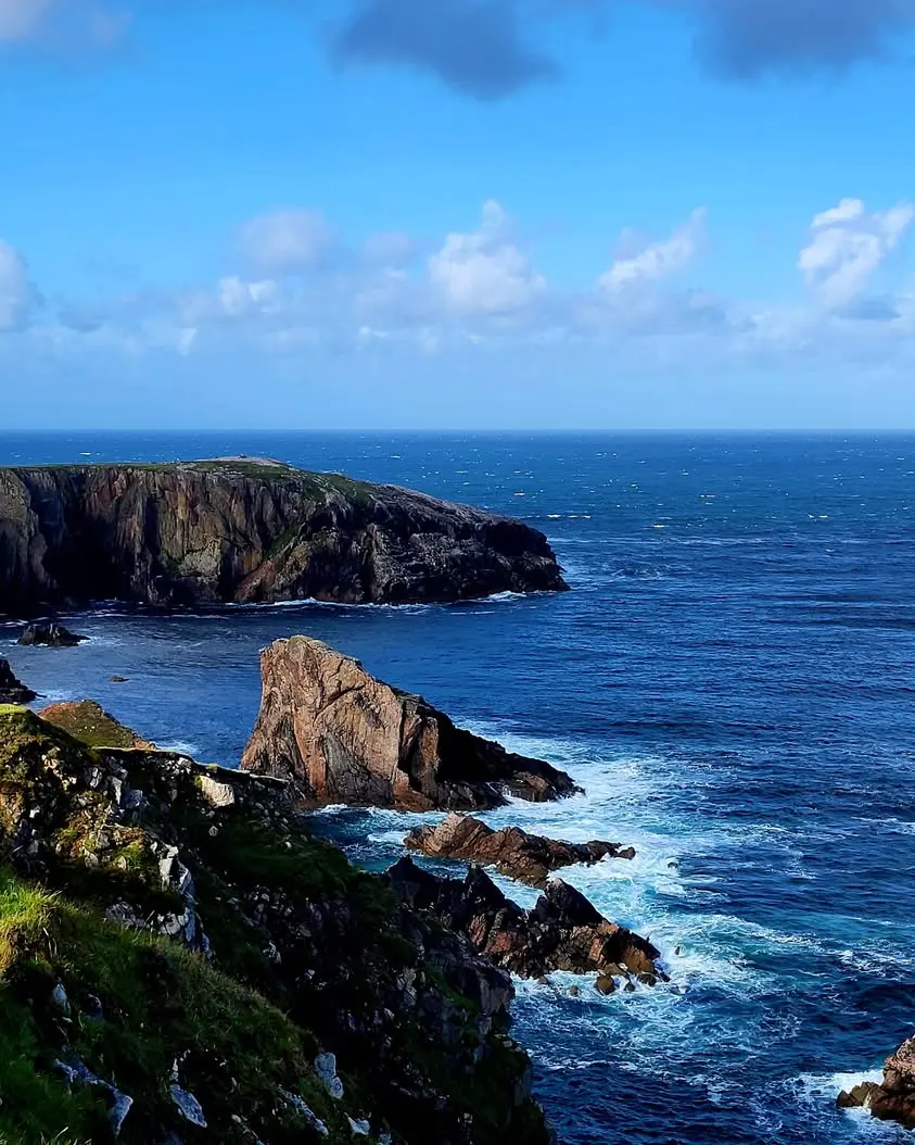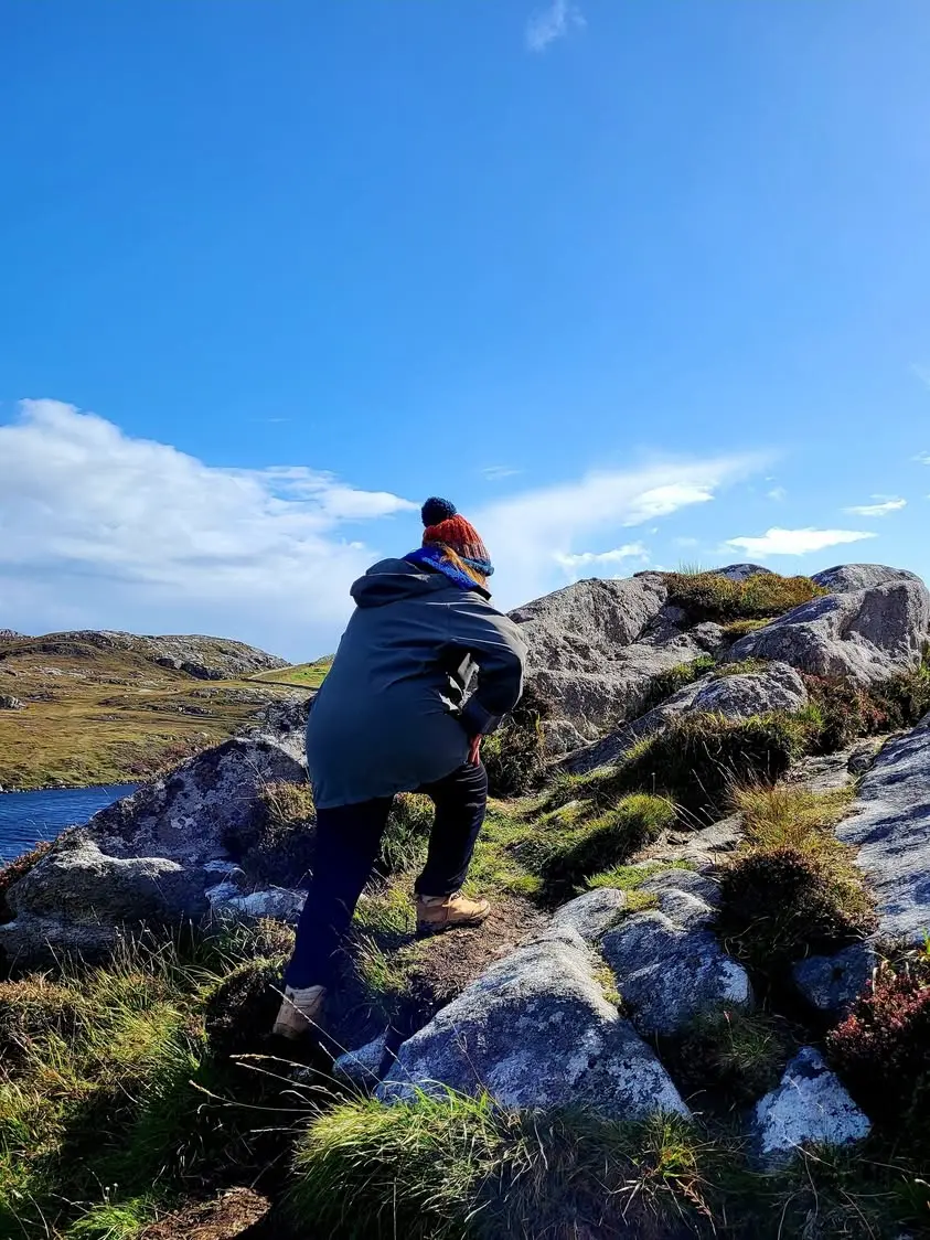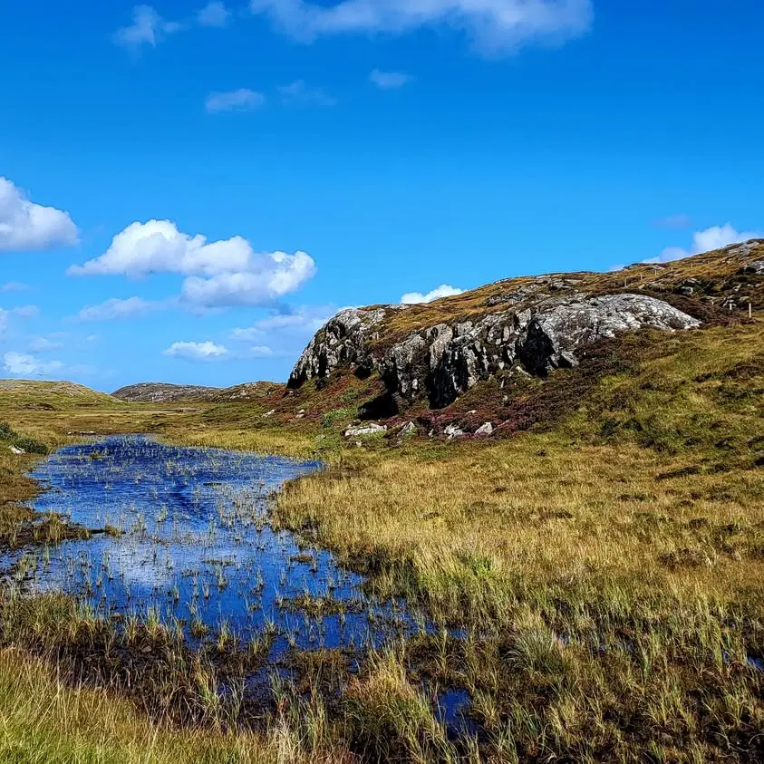 Nous entamons ensuite le sentier proprement dit. Pas de grandes difficultés, si ce n'est un terrain très marécageux où les pieds s'enfoncent facilement. Nous explorons les collines, les lochs et les côtes sauvage. Sous le soleil, c'est sublime 🤩