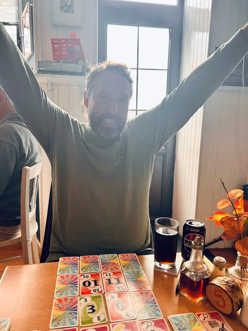 Pour nous réchauffer, on a décidé de passer une partie de l’après-midi dans un café (entendez par là un salon de thé et non un débit de boissons maltées 😉). Ce fut un après-midi mémorable puisque je suis enfin parvenue à battre lamentablement Oli à Skyjo ! 😬